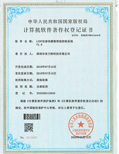 Milont LVDT displacement sensor intelligent control system V1.0 software copyright registration certificate